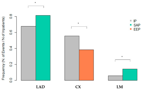 We find an equal anatomical distribution of coronary disease between IP and MENAP. However, we observe in SAP a significant association between the left main artery disease (LM) (p = 0.026) and left anterior descending artery disease (LAD) (p = 0.033) compared to IP (Table 3). In addition, we observe a higher prevalence of circumflex (Cx) CAD in EEP (p = 0.026) compared to IP (Figure 3).