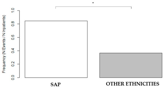 Prevalence of three-vessel CAD in a younger age group, 40–50 years old, in the SAP population compared with other ethnicities. Frequencies (N events/N Inpatients): SAP 11/13 = 0.85; other ethnicities 22/60 = 0.37. SAP = South Asian patients and CAD = coronary artery disease (* p < 0.05).