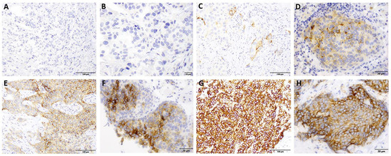 CD47 staining by IHC. (A,B) No staining at 20x and 40x magnification, respectively. (C,D) Weakly positive staining at 20x and 40x magnification, respectively. (E,F) Moderately positive staining at 20x and 40x magnification, respectively. (G,H) Strongly positive staining at 20 and 40x magnification, respectively.