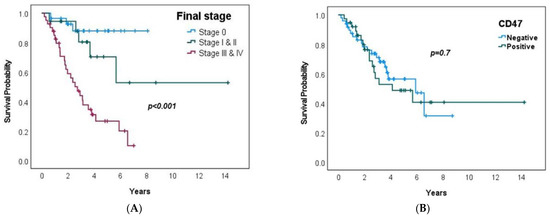 (A) (left) Kaplan–Meier curve of OS and CD47 negative or positive expression. (B) (right) Kaplan–Meier curve of OS and final staging.