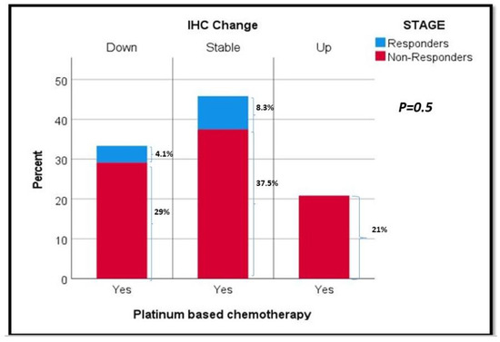 We further analyzed CD47 IHC changes in patients who had matched tissue available from TURBT and RC samples; as a result, patients who underwent a complete pathologic response with no tumor identified on RC were not studied due to a lack of post-treatment tumor. A total of 40 patients were included. Based on the CD47 IHC changes, we defined the expression as “stable” vs. “up” vs. “down”. Table 3 shows the association between NAC (responders vs. non-responders) and changes in CD47 IHC scoring (from TURBT and matched RC samples). There was a slight positive trend for decreased CD47 levels between TURBT and RC in patients who received NAC (p = 0.5), though this did not reach statistical significance (Figure 4).