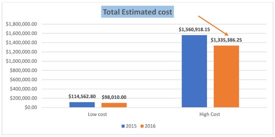 As shown in Figure 3, there was a 14% and 17% drop in terms of low costs and high costs, respectively, due to the 7% reduction in the threatened preterm labor admissions with the introduction of an FFN test, which resulted in a significant cost saving. It is worth mentioning that preterm delivery in our hospital stayed almost the same (10% and 11.5%) before and after the test, respectively, which corresponds to the CDC reports from 2008 [32] (12.3%). This overall cost reduction, though evident, was lower than our expectation, especially in the context of a large tertiary governmental hospital. Our understanding and analysis of this can be summarized as follows: the unspecificity of the presenting symptoms of threatened preterm labor may increase the use of unnecessary FFN test kits to support the diagnosis prematurely, which was added to the cost [33]; the absence of risk stratification tools or checklists, so women can be categorized as being at low- or high-risk for preterm delivery groups which will decrease the need for using FFN unnecessarily for the high-risk group; and finally, the unconscious effect on a physician’s decision where positive FFN acted as a motive to admit or take extra precautions such as medication without clinical indication. This pointed to the possible limitations of our study: cervical length measurement was not considered in the initial assessment which could have allowed us to compare two categories regarding the cost-effectiveness. We included the direct year after FFN implementation where the new protocol compliance may still not be that strong, and no grouping of women into low- and high-risk for preterm delivery with individual cost analyses.