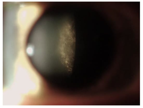 VK consists of bilateral whorl-like opacities with a vortex pattern located in the superficial corneal layers, most commonly in the inferior corneal area. These opacities are typically cream-colored, ranging from whitish to golden-brown. In the early stages, the opacities may form fine horizontal lines, but they later develop into curving lines, radiating from a point below the center of the cornea, forming small whorls, before becoming almost straight at the periphery. The pattern and location of these corneal deposits may be related to the influence of ocular hydrodynamics, periodic blinking, ocular magnetic fields, and/or the centripetal movement of the renewing epithelial cells from the periphery toward the center of the cornea [45,46,47] (Figure 1).