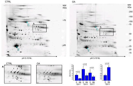 The gel’s image analysis allowed the quantification of only the spot intensities systematically present in all gels of each class. Four spots showed a significant level change between classes, including three spots down-expressed and one strongly over-expressed in OA groups compared to controls (Figure 1A).