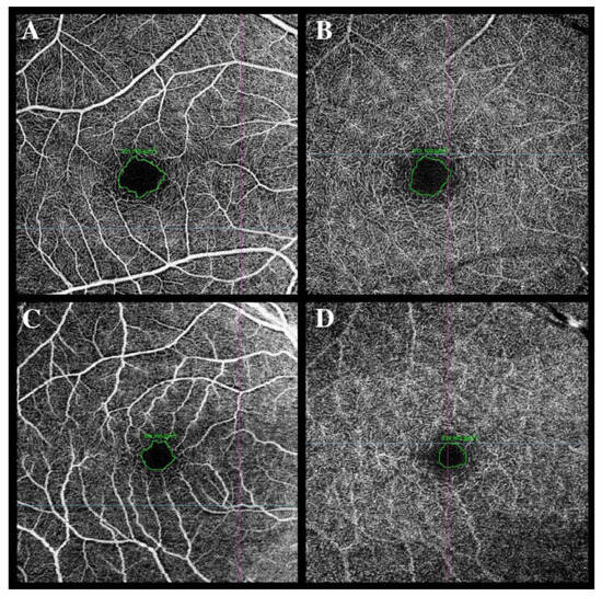 In the study by Kal et al., women had a statistically significantly reduced VD foveal in SCP at the first visit. The FAZ area in SCP was also significantly increased in women compared to men [68] (Figure 2). DCP analysis also revealed gender-related differences: VD was significantly reduced in women in the temporal area at the first visit, which was not found in the male group. Six months later, VD in the frontal area, like VD in the temporal area, was reduced in women compared to men. In CC, the female group presented increased VD in the supratemporal area 6 months after hospitalization [68].