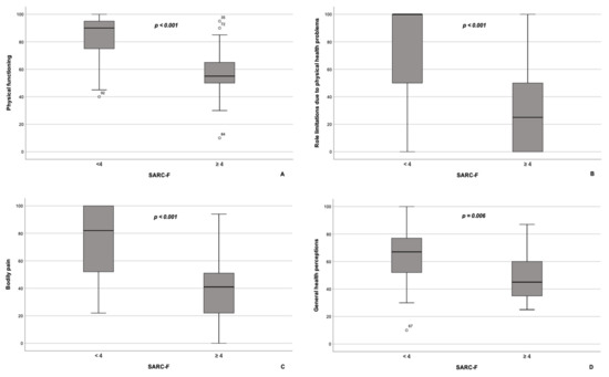 Box plot of the subscales comprising the physical component summary of the SF-36 questionnaire for patients with NAFLD with (n = 17) and without sarcopenia (n = 91). Patients with NAFLD and sarcopenia had significantly lower scores on physical functioning (A), role limitations due to physical health problems (B), bodily pain (C), and general health perceptions (D) subscales compared to patients with NAFLD without sarcopenia. The line through the middle of each box represents the median. The length of the box, thus, represents the interquartile range. The error bars show the minimum and maximum values of each subscale. Outliers are depicted as circles. All comparisons are performed using Mann–Whitney U test.