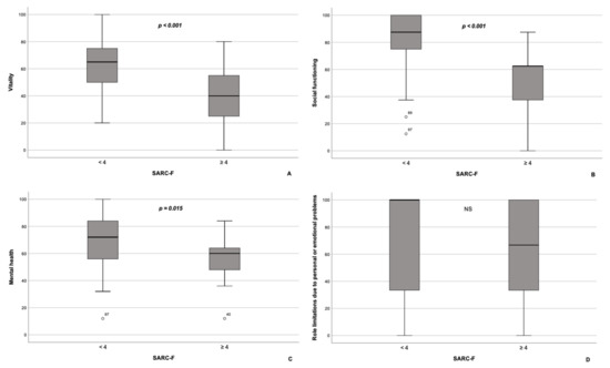 According to our results, PCS scores (27.6 (26.3–39.0) vs. 49.5 (44.1–56.6), p < 0.001), as well as the scores on all subscales comprising the PCS, namely, PF, RP, BP, and GH, were significantly lower in NAFLD patients with sarcopenia compared with NAFLD patients without sarcopenia (Figure 1A–D). Contrarywise, scores on MCS were similar between the subgroups (45.2 (37.2–51.2) in NAFLD patients with sarcopenia vs. 48.8 (41.9–55.5) in NAFLD patients without sarcopenia, p = 0.092). As for subscales, constituents of MCS, scores on VT, SF, and MH subscales, were significantly lower in patients with NAFLD and sarcopenia compared with the subgroup of NAFLD patients without sarcopenia (Figure 2A–C), whereas RE scores did not differ significantly between the groups (p = 0.370; Figure 2D).