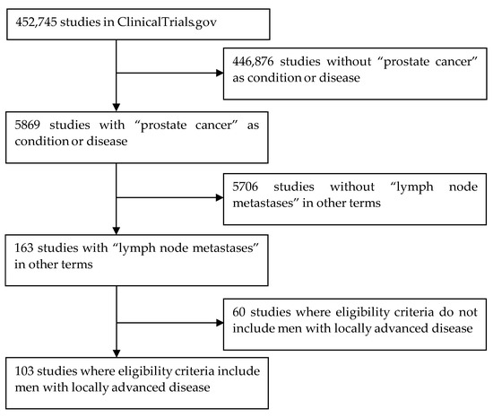 A query of [prostate cancer] in “condition or disease” and [lymph node metastases] in “other terms” on 18 May 2023 found 103 studies after removal of 60 studies where the eligibility criteria did not include locally advanced disease (Figure 1). A file listing details of all studies has been included with this article as a Supplementary Item (Table S1). Characteristics of these studies are as follows.
