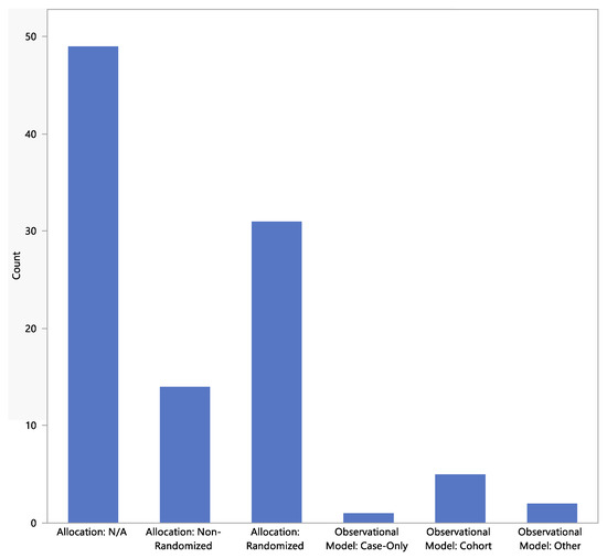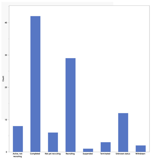 The status of the studies is shown in Figure 2. Most studies had “completed” (the study had ended normally, and the last participant’s last visit had occurred), and a comparable proportion were either “recruiting” or “active and not recruiting”. One study was marked as “suspended” but may start again. The three studies that had been “terminated” had stopped early and will not start again. The two studies marked as “withdrawn” stopped before enrolling the first participant. The 12 studies marked as “unknown” had a last known status of “recruiting”, “not yet recruiting”, or “active and not recruiting” but have passed their completion dates, and the status had not been verified within the past two years.