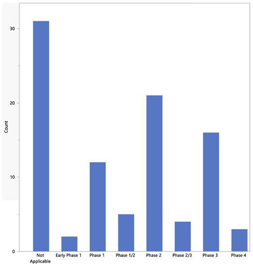 The phases of the studies are shown in Figure 4. For most studies, the phase was “not applicable”, mainly because these were observational or diagnostic studies.