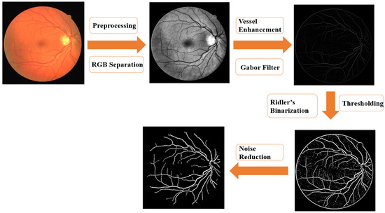 Figure 2 demonstrates that the algorithm can be broken down into these four distinct steps. In the first step of the process, pre-processing was used to emphasize the blood vessels, small noise was binarized and removed (as it is in RGB images), and the green component of the image was extracted for pre-processing. This was carried out because the green component of the image has obvious contrasting characteristics in comparison to the other two different components. In the second step of the process, a Gabor Filter was applied to the image in order to improve the data on blood vessels so that they could be seen more clearly. The schematic diagram of a two-dimensional Gabor Filter was shown in Supplementary Materials Section S4 [47]. Gabor filter is a linear filter commonly used for edge detection. A two-dimensional Gabor filter is a Gaussian function modulated by sinusoidal plane waves. Given that its representation in the spatial domain and frequency domain is similar to human biological vision specificity, it can intuitively describe the structural information, such as the spatial position of images, directional selectivity, and spatial frequency.
