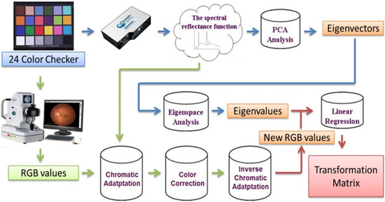 After that, the hyperspectral image processing was carried out in three distinct stages, as can be seen in Figure 3. In the first step toward obtaining the relationship matrix between the fundus camera and the spectrometer, the data of the light source spectrum for the two instruments as well as the data of the reflection spectrum for the light source and 24 color-checker in the visible band (380–780 nm) were collected. This was carried out so that the relationship matrix could be obtained. In addition to the data, the standard 24-point color checker was used as the subject for measurement, which contributed to the increased accuracy of the transformation. Second, spectral analysis was carried out, and PCA was utilized in order to simplify the data. For the purpose of determining the eigenvalues, the eigenvectors of the first six groups were chosen to serve as the reference spectrum. After that, the linear regression technique was applied in order to determine the nature of the connection that exists between the eigenvalues and the fundus images. In the end, a transformation matrix was constructed in order to simulate the spectrum of each pixel value present on the image.