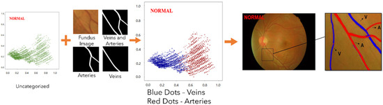All the anatomical structures need to be examined and understood for the prognosis of all the relevant diseases in the retina [1,2]. Specifically, classifying the retinal vessels into veins and arteries will act as an important biomarker for various eyesight-related disorders [3]. Some cardiovascular diseases, diabetes, and various other diseases will cause variations in the natural diameters of these veins and arteries in the early stages of these diseases [4,5]. However, if these diseases are diagnosed in their early stages, the survival rate of the patients can be drastically increased [6]. During the early stages of the classification of arteries and veins, traditional image processing techniques were used along with artificial neural networks (ANN) [7,8,9,10]. After the introduction of deep learning, convolution neural networks (CNN) greatly increased the accuracy of the models [11,12,13]. However, in recent years, fully convolution neural networks (FCNN) have begun being employed along with various architectures such as U-net, Res-net, and Fusion-net for segmentation of arteries and veins in fundus imaging [14,15,16,17].