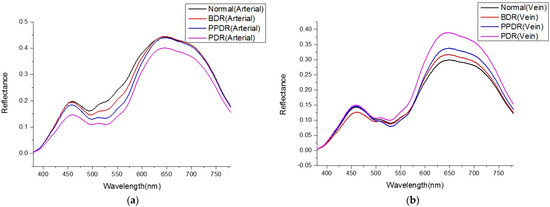 (a,b) the average reflectance spectrum of normal, BDR, PPDR and PDR DR arteries and veins, respectively.