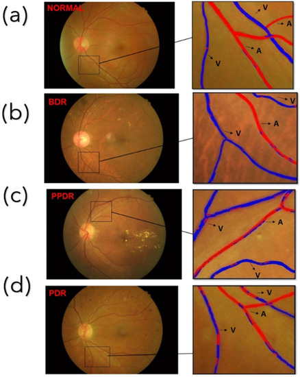 Shows the classification results of blood vessels. (a–d) show the classification results of blood vessels in the normal, BDR, PPDR, and PDR categories.