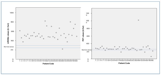 The PAT test (OB manager, FRAS5, H&D, Parma, Italy) is an automated test designed to assess the antioxidant capacity of plasma by measuring its ferric-reducing ability. Ferric to ferrous ion reduction causes a color change that can be photometrically assessed, as previously described [12]. PAT test values above 2800 μmol/L indicate a very high level of oxidative stress [12].