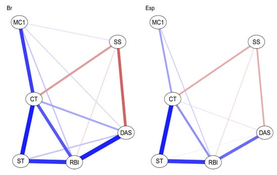 The figures below represent graphical objects (graphs) corresponding to the matrix of regularized partial correlations through which the associations between variables (nodes) are shown. The relationship between the nodes is shown with edges (lines) in blue for directly proportional associations and red for inversely proportional ones. The thickness of each line determines the magnitude of the association between the nodes.
