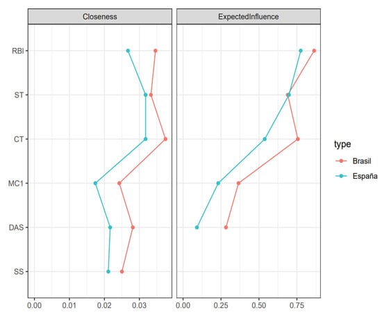 The comparative analysis of centrality measures between nodes (Closeness) and expected influence of the scales is presented in Figure 2. The variable that was most correlated with the others, for Brazil and for Spain, in the centrality measures of the scale invariance network was the work context (CT), and the one that most influenced the network as a system was Role Blurring (RBl) in both countries.