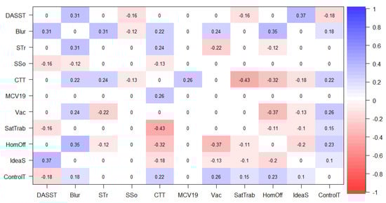 In Figure 6, which represents the data of partial correlation between the scales and sociodemographic variables in Spain, a strong positive relationship is observed between symptoms of anxiety, stress, and depression (DAS) and suicidal ideation (IdS), as well as a strong negative relationship between job satisfaction (StT) and difficulties in the work context (CTT). A moderate, but noteworthy relationship is that being vaccinated (Vac) is negatively associated with IdS. Similarly, the subset of positive relationships between difficulties in the work context, Role Blurring (Blr), and work overload (STr) stands out. On the other hand, as expected under the health safety conditions offered in the Spanish territory, being Vaccinated was negatively correlated and working from home (HmO) was positively correlated with the sense of loss of control of time during confinement (CnT).