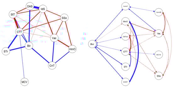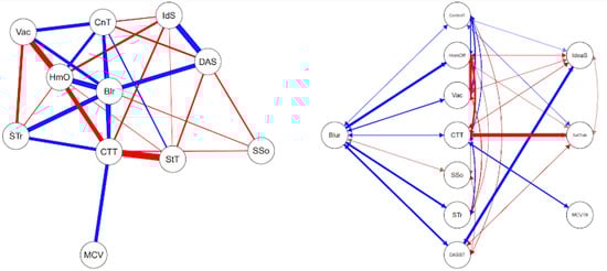 The network (right-hand side) and flowchart (left-hand side) graphs of the Spanish sample in Figure 5 show that the variable HmO is associated with Blr when positively mediated by the feeling of loss of control of time during confinement. Fear of COVID-19 is associated with Blr mediated by the positive association of CTT. On the other hand, there is a negative relationship between Vac and Blr when mediated by IdeaS. Finally, it is interesting to note that Blr is positively associated with CTT, and the relationship between CTT and perceived social support is inverse. The relationship between Blr and HmO, Vac, MCV19, and SSo is of second order, while with other variables, it is direct. It is noteworthy that the association between DAS and IdeaS is inverse, i.e., Blr and IdeaS have a negative relationship, and the relationship between Blr and DAS is positive.