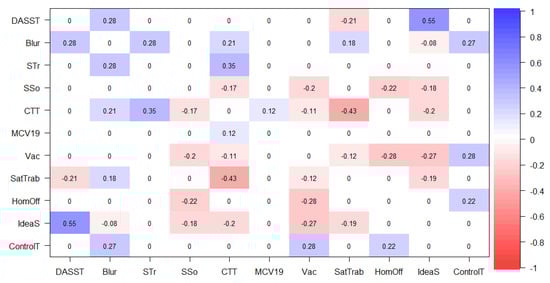 GeLasso Method, Partial Correlation Matrix of Scales and Sociodemographic Variables in Brazil. Note: SSo = Social Support, MCV19 = Fear of COVID-19, STr = Work Overload, DASST = Anxiety, Depression and Stress Symptoms, Blur = Role Blurring, CTT = Difficulties in Work Context, HomOff = Working in Home Office mode, SatTrab = Job Satisfaction, ControlT = Sense of Loss of Control of Time during Confinement, Vac = Being vaccinated, IdeaS = Suicidal ideation.