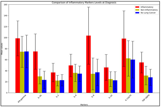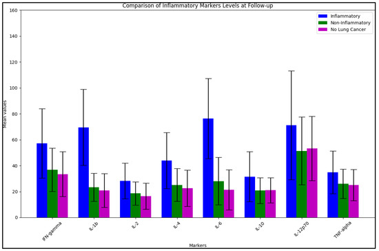 The data in Table 3 describe the BALF analysis of inflammatory markers in lung cancer patients with inflammatory BALF, non-inflammatory BALF, and the control group, respectively. At diagnosis, the analysis revealed statistically significant differences between the comparison groups for several inflammatory markers. IFN-gamma levels were significantly higher in the inflammatory group (98.7 ± 31.6 pg/mL) than in the non-inflammatory group (74.3 ± 28.1 pg/mL) with a p-value of 0.038. IL-1b levels were also significantly higher in the inflammatory group (74.8 ± 32.1 pg/mL) compared to the non-inflammatory group (29.7 ± 13.5 pg/mL) with a p-value of <0.001. Similar significant differences were observed for IL-2 (p = 0.010), IL-6 (p < 0.001), IL-10 (p = 0.009), and IL-12p70 (p = 0.040). TNF-alpha levels were also significantly higher in the inflammatory group (55.1 ± 18.9 pg/mL) compared to the non-inflammatory group (31.3 ± 16.7 pg/mL) with a p-value of 0.001, as seen in Figure 1.
