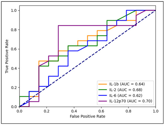 Table 4 presents the receiver operating characteristic (ROC) plot analysis for the inflammatory markers involved in estimating the risk for lung cancer. IL-12p70 showed the highest AUC value (0.702), followed by IL-2 (0.682), IL-6 (0.620), IL-4 (0.611), TNF-alpha (0.609), IL-10 (0.604), IL-1b (0.635), and IFN-gamma (0.521). Statistical significance was observed for IL-1b (p = 0.044), IL-2 (p = 0.040), IL-6 (p = 0.001), IL-10 (p = 0.008), IL-12p70 (p = 0.001), and TNF-alpha (p = 0.046), indicating that these inflammatory markers are significantly associated with the risk of lung cancer. The sensitivity and specificity percentages reflect the marker’s ability to correctly identify patients at risk for lung cancer (sensitivity) and those not at risk (specificity). IL-6 showed the highest sensitivity (73%), followed by IL-12p70 (70%). In terms of specificity, IL-1b had the highest specificity (69%), followed by IL-12p70, as described in Figure 3.