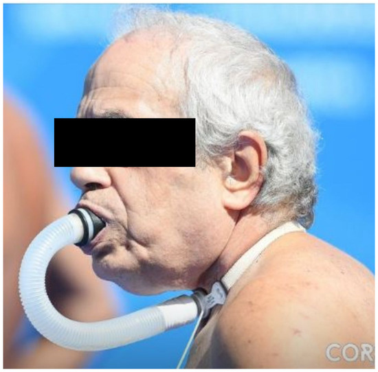 DG aged 60, underwent total laryngectomy and bilateral lateral cervical emptying for adenoid cystic carcinoma which had subglottic localization (Figure 1). The patient was an assiduous swimmer, enrolled in an amateur sports club, had achieved good results in numerous category competitions Seniors. After the operation, the patient experienced an initial period of depression despite the psychological support of our health facility and family members. After having overcome the distrust towards the resumption of sporting activity due to fears about its feasibility, he accepted the invitation to resume the sporting activity. A special device was therefore used (Figure 2). It establishes a watertight seal with a double-cuffed rigid tracheostomy tube. The configuration is similar to a snorkel device. The cuffed tracheostomy tube connects to a flexible hose with an attached mouthpiece. The mouthpiece is gripped with the teeth and sealed by the lips. Air flows through the nose, around the palate, into the mouth, through the Larkel tubing and into the lungs.