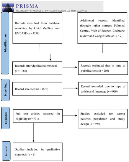 Our research after duplicate removal focused on 1881 studies. We excluded 203 articles due to time of publication and then 1619 were finally screened. The subsequent exclusion of articles due to the above criteria led to the definition of six articles. We summarized the included studies in Scheme 1.