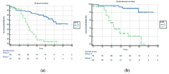 The statistical analysis was performed using MedCalc Statistical Software (MedCalc Software Ltd., Ostend, Belgium; http://www.medcalc.org, accessed on 3 April 2023). The normality was evaluated using the Kolmogorov-Smirnov test. For data that were normally distributed, the mean ± standard deviation (SD) and T-test were employed, whereas data that did not exhibit a normal distribution were described using the median and quartiles 1 and 3 (Q1; Q3) (IQR) and analyzed using the Mann-Whitney U test. Categorical data were presented as frequencies and percentages and analyzed using the chi-squared test. The patients were categorized according to the presence or absence of cardiovascular and overall mortality.