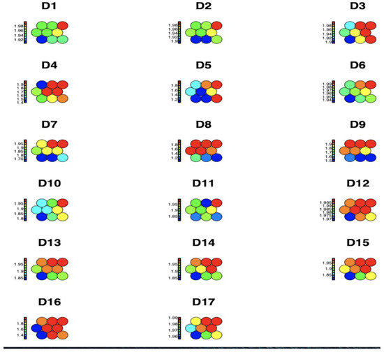 Figure 1 shows the average impact values of each of the 17 observed chronic non-communicable diseases by region and age group within each node, represented through a heat map for a Kohonen SOM neural network. The higher disease concentrations are shown in red, while medium and lower disease spread concentrations are shown in blue, green, and yellow, respectively. It can be concluded that D16 High_Cholesterol is identified as having the highest prevalence.