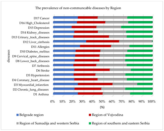 The societal and scientific contribution of this study can be seen through its main goals. The first goal was to identify the prevalence of 17 chronic non-communicable diseases by region and age group among the residents of Serbia. Based on the results obtained in Section 4, it can be concluded that the spread of chronic non-communicable diseases is higher in less developed regions of Serbia such as Sumadija and western Serbia, with average values of 2.1%, or 277 residents. On the other hand, all diseases are the least present in the most developed region of Serbia, the Belgrade region, with an average of 1.7%, or 224 residents.
