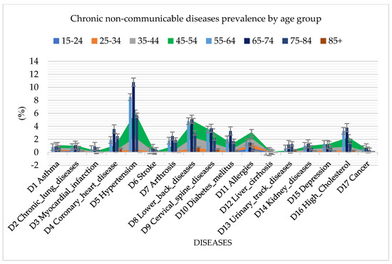 Analyzing the spread of diseases by age groups, in addition to cardiovascular diseases, which are the common diseases among the population in Serbia, the random forest algorithm also identified a high presence of diabetes mellitus, arthrosis, urinary tract diseases, and high cholesterol (Figure 3). The highest incidence rate of all diseases was found in the age group of 65 to 74 years, which reached a percentage of 42.3%.