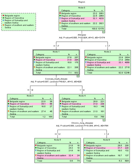 The spread of cardiovascular diseases with hypertension as a common health issue among the residents of Serbia was confirmed using the decision tree algorithm, shown in the tree’s root structure, e.g., by region in Figure 4.