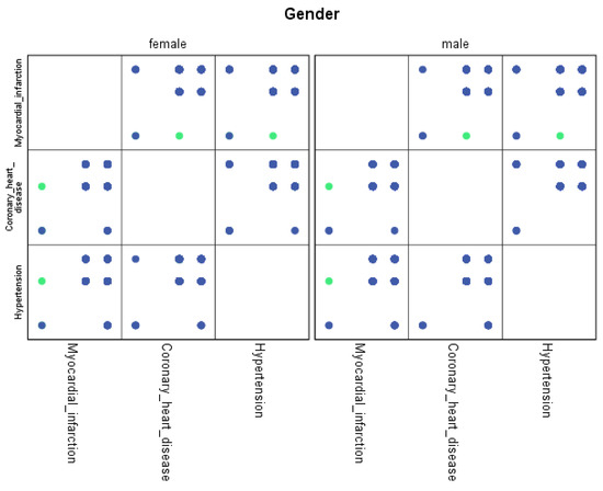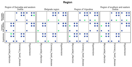 For each region, machine learning algorithms have identified the presence of one or more comorbidities, up to a maximum of six. The Belgrade region displayed the presence of one comorbidity at 1.9%, two comorbidities at 1.1%, three comorbidities at 0.7%, four at 0.4%, and the presence of five and six comorbidities at 0.1%. The Vojvodina region showed the presence of one comorbidity at 2.1%, two comorbidities at 1.2%, three comorbidities at 0.6%, four at 0.5%, and the presence of five at 0.3% and six comorbidities at 0.1%. The Sumadija and western Serbia region revealed the presence of one comorbidity at 3.2%, two comorbidities at 2.2%, three comorbidities at 1.3%, four at 0.7%, and the presence of five at 0.6% and six comorbidities at 0.2%. The southern and eastern Serbia regions showed the presence of one comorbidity at 1.1%, two comorbidities at 0.9%, three comorbidities at 0.5%, four at 0.3%, and the presence of five and six comorbidities at 0.1%. Graphical representations of the obtained results manifesting the hypertension as a leading (a common) disease with associated comorbidities have been shown in Figure 7, by region, in Figure 8 by group, and in Figure 9 by gender. In Figure 7, Figure 8 and Figure 9, the blue dots represent the highest prevalence of comorbidities in relation to the three most influential cardiovascular diseases: hypertension, coronary heart disease, and myocardial infarction. The green dots represent the lowest presence of comorbidities for the aforementioned three diseases by region, age group and gender, respectively.