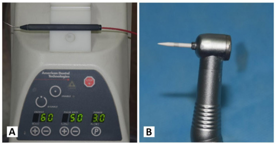 (A) Nd:YAG laser PLUSMASTER 600 IQ. (B) Gingival trimming ceramic bur (Ceratip).