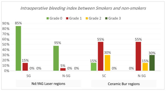 Intraoperative bleeding index. Bleeding during the treatment for both procedures is shown in Table 1 and Table 2 and Figure 3 and Figure 4. Results showed that 90% of regions treated with Nd:YAG groups scored grade 0 on the bleeding index (85% of SG and 95% of non-SG), while only 10% scored grade 1 (15% of SG and 5% of N-SG). On the other hand, 7.5% of regions treated with the bur group scored grade 0 (7.5% of SG and 0% of N-SG), 55% scored grade 1 (55% of SG and N-SG), 22.5% scored grade 2 (30% of SG, and 15% of N-SG), and 15% scored grade 3 (30% of SG). Bleeding in the bur group (mean rank = 57.75) was statistically significantly higher than in the Nd:YAG group (mean rank = 23.25) (p = 0.00). At the same time, the difference was insignificant between SG and N-SG patients in terms of bleeding for each treatment (p > 0.054).