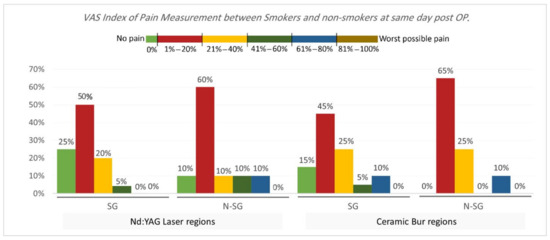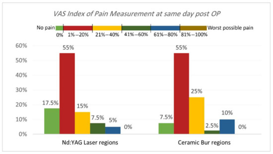 VAS Index of Pain Measurement. The VAS index of pain is shown in Table 3 and Table 4 and Figure 5 and Figure 6. On the same day, and at the 3rd and 7th days post-OP, relating to pain score, the majority of patients treated with Nd:YAG and bur treatment had a painless experience on the same day of the procedure (82.5%, and 92.5%, respectively) compared with 22.5% and 20%, respectively, at the 3rd day, and 0% for both groups after the 7th day. There was no significant difference between treatment groups on the same day, 3rd, and 7th days (p >0.489). On the other hand, 75% of SG and 90% of N-SG in Nd:YAG treated regions, and 85% of SG and 100% of N-SG in the bur group had a painless experience on the same day of the procedure. On the 3rd day post-OP the figures were 5% of SG, 40% of N-SG, and 10% of SG and 30% of N-SG, respectively. However, no significant differences were observed between S and N-S groups on the same day and 7th day (p > 0.713).