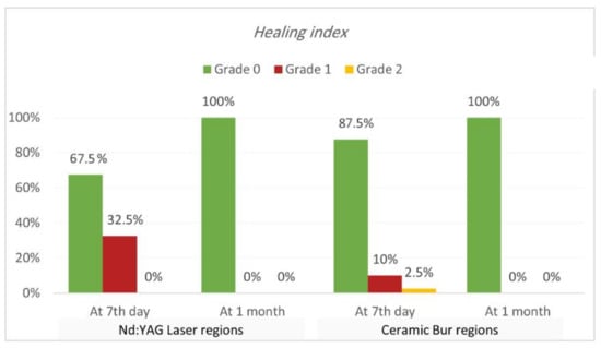 Healing index. Healing index results are shown in Table 5 and Table 6 and Figure 7 and Figure 8. The current study analysis exposed that more than two-thirds in all groups had complete healing seven days following the treatment; Nd:YAG-treated regions scored 0 in 67.5% of areas (70% of SG, and 65% of N-SG), while the bur-treated group scored 0 in 87.5% of regions (90% of SG, and 85% of N-SG). A significant difference was observed between the Nd:YAG group (mean rank = 44.3) and the bur group (mean rank = 36.66) (p = 0.041), but there was no significant difference between SG and N-SG in each treatment (p > 0.689). After 1 month, all patients scored 0 on the healing index in both groups, with no significant difference (p = 1.000).
