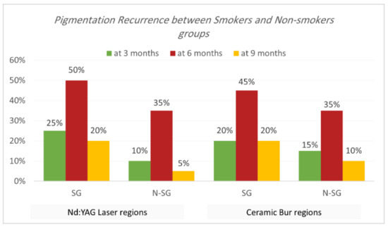 Concerning the effect of smoking on gingival pigmentation, this study showed a higher recurrence rate in SG than N-SG, but statistically no significant difference was observed. Nammour et al. [11] showed that recurrence happened for both smokers’ and non-smokers’ groups; they observed that a diode laser had the most extended period before recurrence compared to patients treated with CO2 and Er:YAG. Moreover, they showed that non-smokers had the longest time before recurrence compared to smokers.