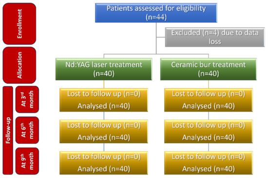 - Ribeiro, F.V.; Cavaller, C.P.; Casarin, R.C.V.; Casati, M.Z.; Cirano, F.; Dutra-Correa, M.; Pimentel, S.P. Esthetic treatment of gingival hyperpigmentation with Nd:YAG laser or scalpel technique: A 6-month RCT of patient and professional assessment. Lasers Med. Sci. 2013, 29, 537–544. [Google Scholar] [CrossRef]