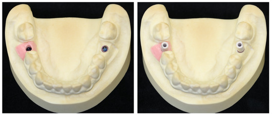 Mandibular model with a gingival mask (right molar) and removed gingival mask (left molar) (right), and with the scanbody screwed on in the region of the first molars (left).