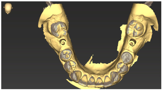 After the implantation was completed, the implant position was recorded by applied scan bodies and an intraoral scan (Trios 4, 3 Shape, Copenhagen, Denmark, see Figure 3 and Figure 4).