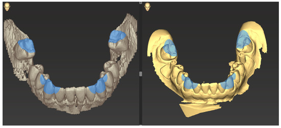 The chewing tip of the two canines and the mesio-buccal cusp tip of the first molar were used as non-variable matching zones for matching the two scans (Figure 6).