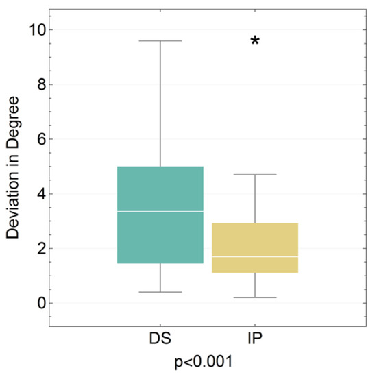 Boxplot for the angular deviation of the dental student (DS) and implantologist (IP) groups (see Table 4). (* extreme values).