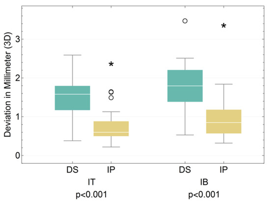 Boxplot for the 3D offset of the dental student (DS) and implantologist (IP) groups at the implant tip (IT) and implant base (IB) (see Table 5). (*: extreme values; O: outliers).