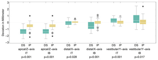 Boxplot for the deviation in X-, Y- and Z-axes of the dental student (DS) and implantologist (IP) groups at the implant tip (IT) and implant base (IB) (see Table 6). (*: extreme values; O: outliers).