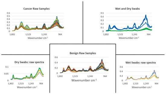 Figure 1 shows all the raw IR spectra derived from saliva samples obtained from participants designated either as cancer-free benign or cancer-positive (this included a mixture of lung cancers and metastases to the lung from previous primary cancers). Except for one outlier in a total of 211 study participant saliva samples (n = 170 benign control, 41 cancer-positive), remarkable consistency in the spectral signature is noted. For comparison, IR spectra derived from wet (sterile milli-Q water) and dry swabs are shown (five independent swabs, three spectra each). An underlying spectral signature from the swab (wet or dry) is noted. Whilst one approach might be to modify sample preparation to minimise substrate contributions [19], the approach contained herein accepts this on the basis that it is consistent enough so that the overlying bio-fingerprint spectra of the saliva samples provide the variables sufficient for chemometric diagnostics.