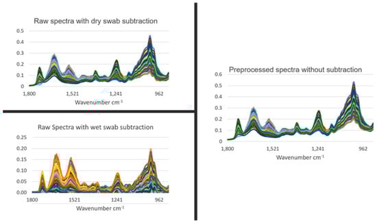 FTIR spectra data (wavenumber range 4000–650 cm−1) for each swab were obtained by directly placing the saliva swab on a portable Agilent Cary 630 FTIR Spectrometer equipped with an ATR ZnSe crystal (Agilent, Santa Clara, CA, USA) and Microlab PC software run from a dedicated computer laptop. Each whole spectrum contains 1798 points (1.86 cm−1 spectral resolution). For every ATR-FTIR spectroscopic measurement, three spectra were obtained from each saliva swab. Each swab analysis was performed with 32 co-additions, interspersed with 32 background scans. After each analysis, the swab was removed from the crystal and the crystal was cleaned with miliQ water and 70% alcohol, thus avoiding inter-sample contamination. Only a single swab analysis in the spectral dataset generated outliers (Figure 1).