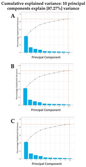 The contribution of the first 10 PCs to variance following PCA. Following pre-processing, a scree plot was constructed for each of the three pairwise comparisons undertaken: (A) benign vs. cancer following swab analysis; (B) benign vs. cancer following swab analysis with subtraction of dry swab spectra; and (C) benign vs. cancer following swab analysis with subtraction of wet swab spectra.